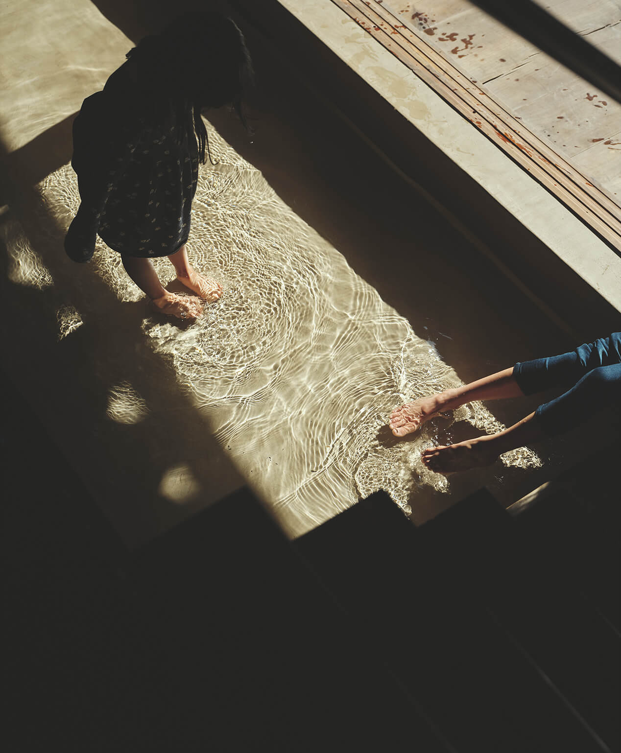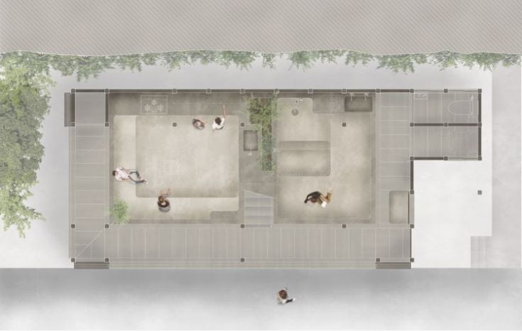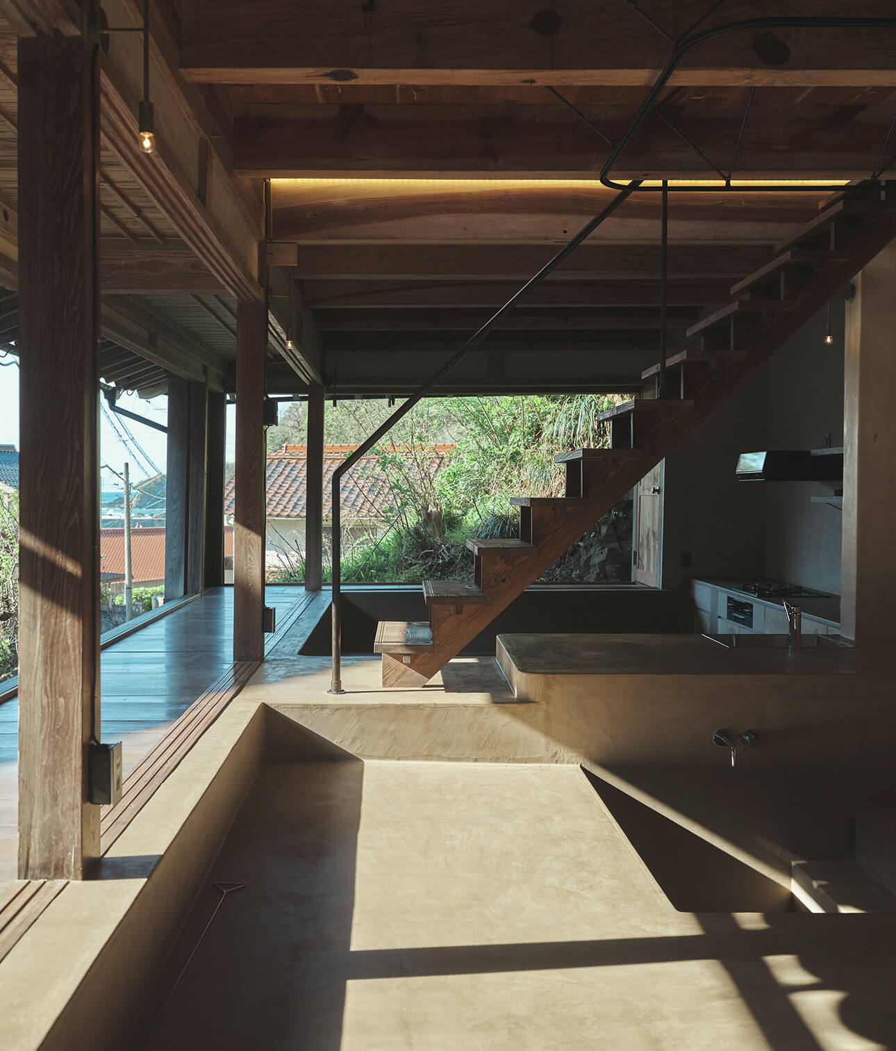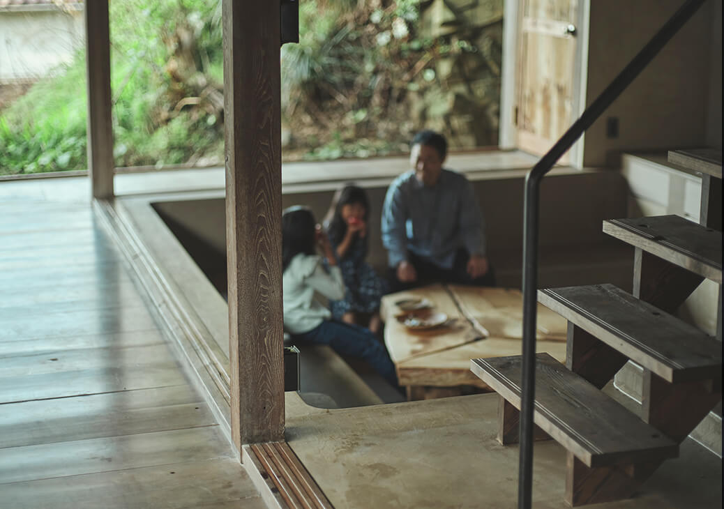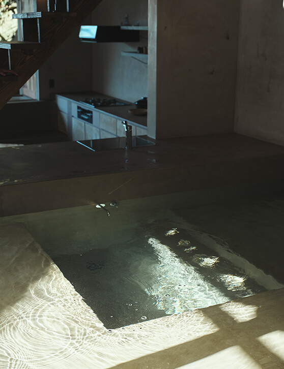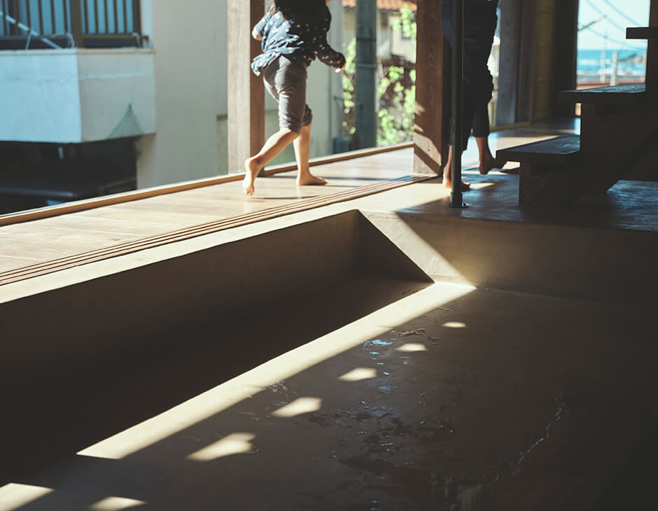 日本の伝統的な土間を再解釈し、炊事や入浴といった生活の機能を地面を掘り込んで一体的に作った1階の空間。
