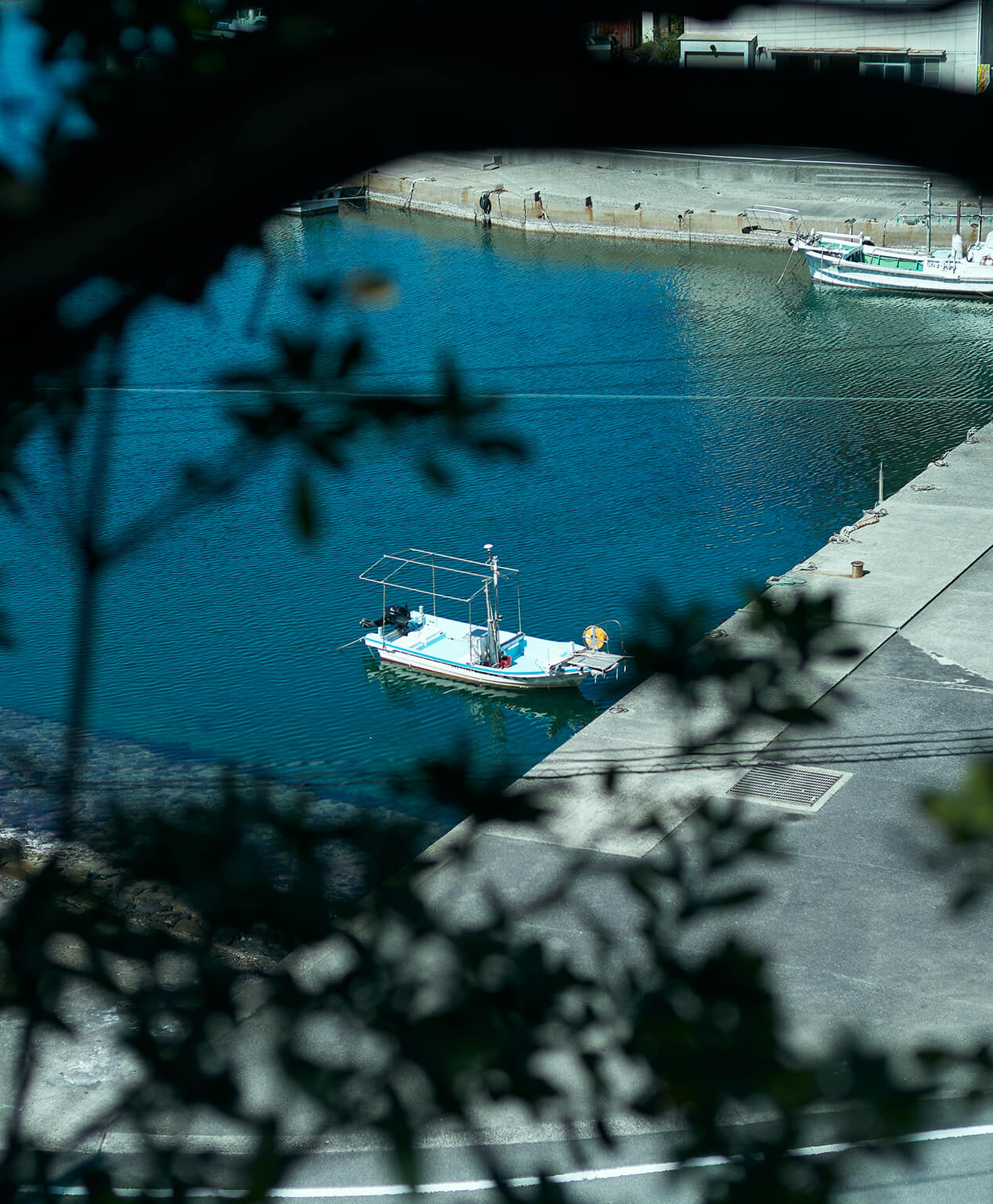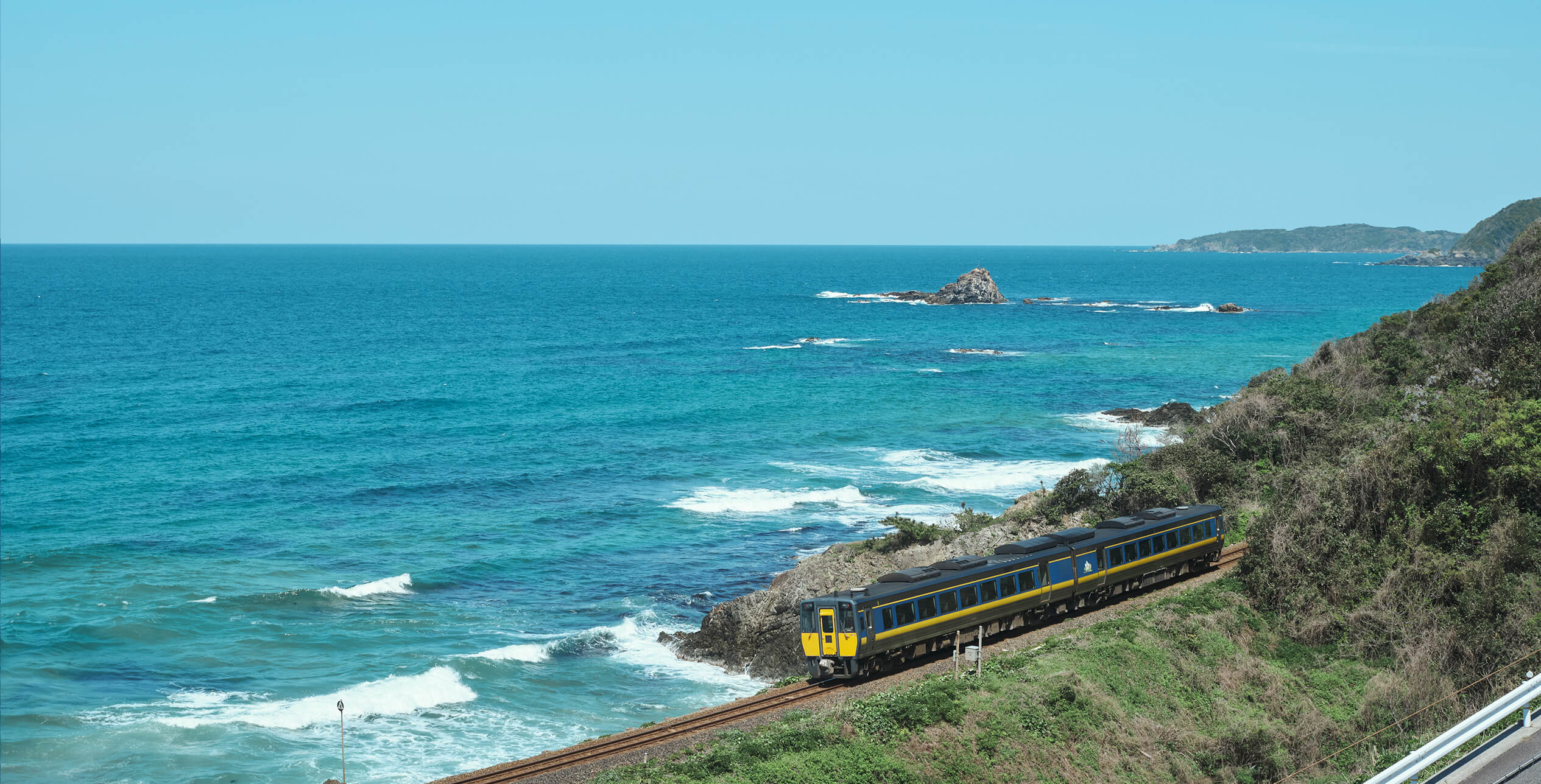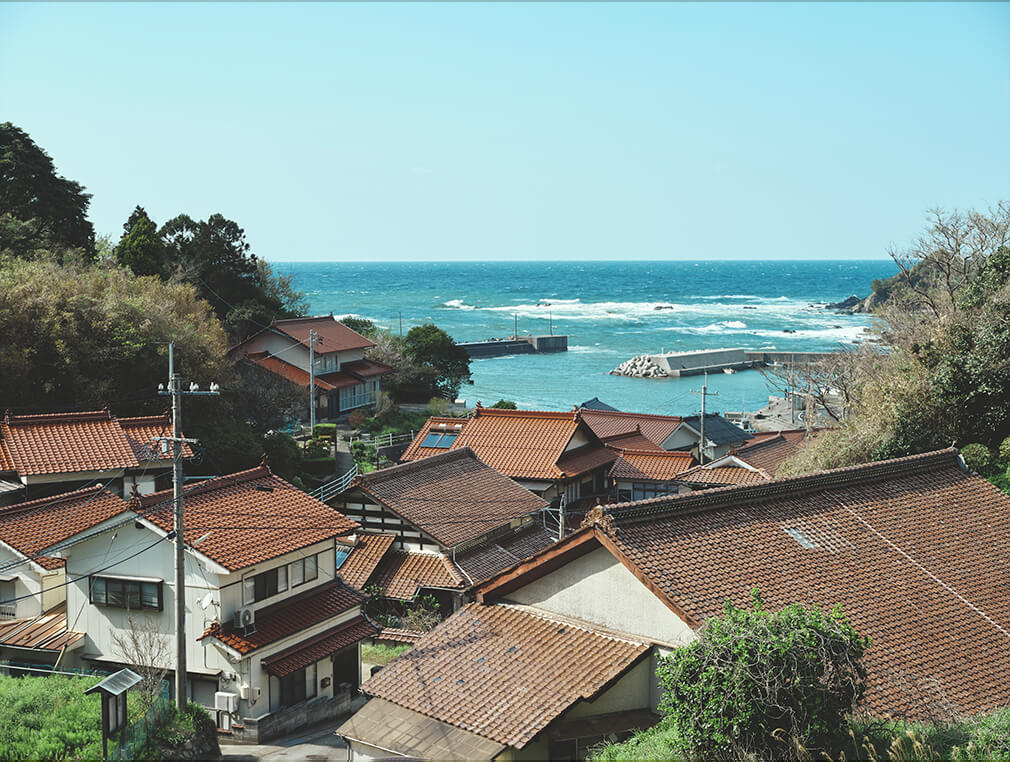 澄み切った青さの日本海。赤瓦屋根の街並み。